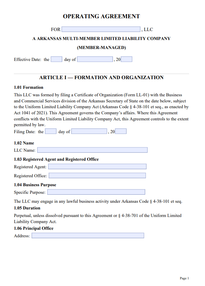 I always start by checking whether an Arkansas LLC operating agreement actually follows the current law under Title 4, Chapter 38. Arkansas replaced its prior LLC framework through Act 1041 of 2021, but a surprising number of free templates online still rely on older statutory language.
