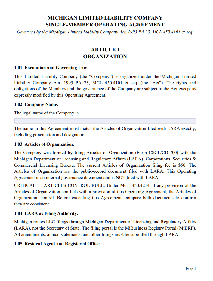 The practical consequence: owners who update the operating agreement without checking the Articles create an unintentional hierarchy of conflicting rules. LARA’s current CSCL/CD-700 form sets a $50 filing fee for the Articles. Before signing any operating agreement, Boost Suite recommends pulling a copy of the filed Articles through the Michigan business entity search portal and comparing both documents line by line.