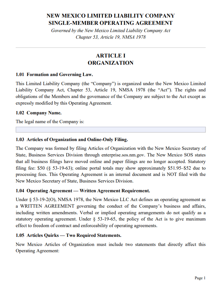 For founders working through a step-by-step New Mexico LLC formation guide, the sections below cover what the Act actually requires. They also walk through how to align the OA with the Articles of Organization and what the state defaults look like without one.