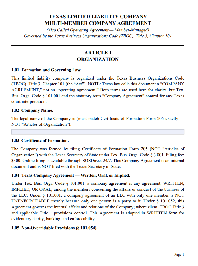 Texas Business Organizations Code § 101.001(1) defines the document as a company agreement, not an “operating agreement.” Most banks, lawyers, and Texas Secretary of State filing clerks accept either label, but the statutory term controls if a dispute reaches a Texas court. Under Title 3, Chapter 101 of the laws of state Texas, judges interpret member disputes accordingly, and they expect the document to track that vocabulary.